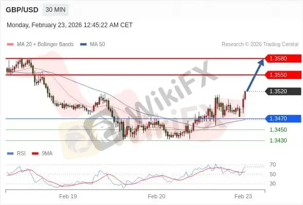 交易策略: 在 1.3470 之上,看涨,目标价位为 1.3550 ,然后为 1.3580。