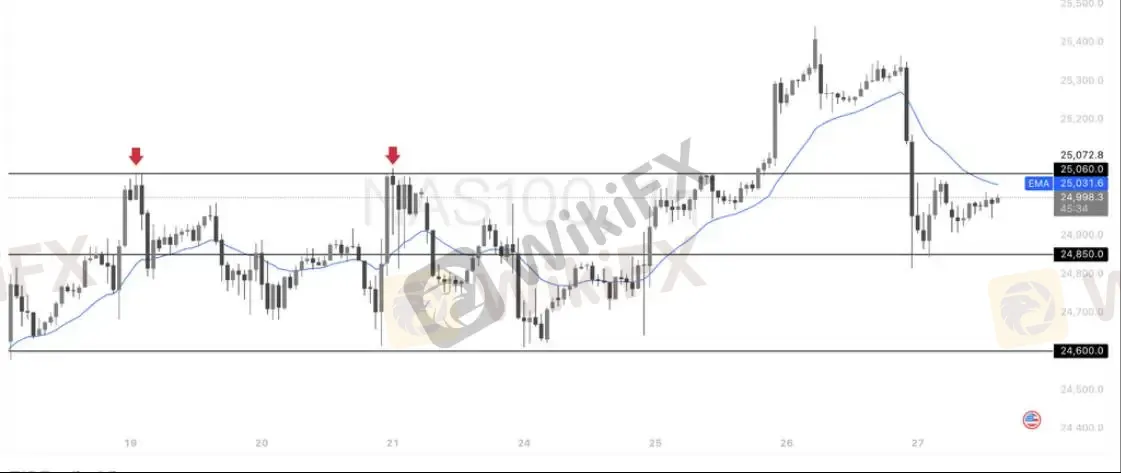 从结构来看,25060一线是明显的阶段性压力(前高两次受阻,图中红箭头所示),价格多次触及未能有效站稳,形成短期供给区。当前指数在快速冲高回落后,跌破并回踩 20EMA(约25030),均线开始拐头向下,动能由强转弱。