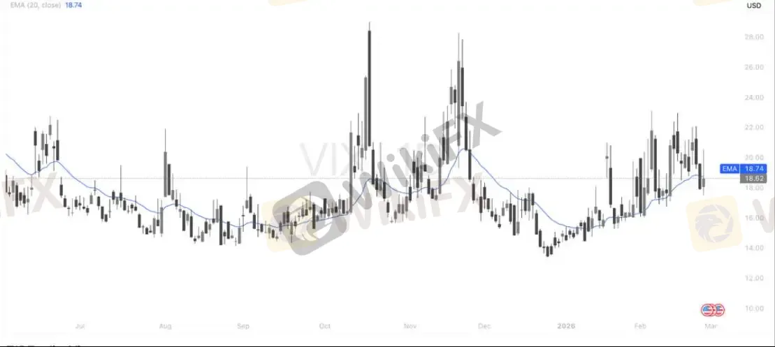 从结构来看,VIX 在 14 一线形成阶段低点后快速反弹,最高冲至 28 附近,随后高位回落,目前回踩 20EMA(约18.7) 附近震荡。
