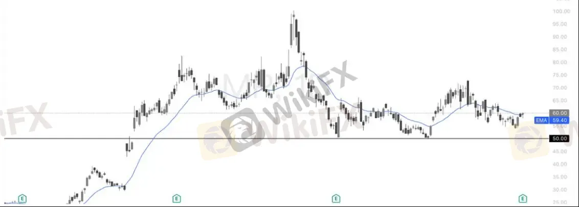 MP 日线结构目前处于高位回落后的震荡修复阶段。前期冲高至近 100 美元后形成明显阶段顶部,随后一路回落至 50 美元附近获得支撑,当前价格在 50–60 区间横盘整理。20 日均线走平于 59 美元附近,价格围绕均线反复拉锯,显示多空力量趋于平衡。只要 50 美元关键支撑不破,中期结构仍属于回调后的筑底过程;若放量突破 60–62 区域,则有望开启新一轮反弹;反之跌破 50,则可能重新测试更低支撑。当前更偏区间博弈,等待方向选择。