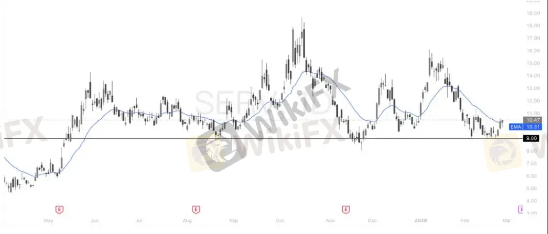SERV日线目前处于阶段性回调后的企稳修复阶段。前期冲高至 18 上方形成明显高点后一路回落,最低下探至 9 美元一线获得支撑,当前价格在 9–11 区间震荡。20 日均线约在 10.3 美元附近,均线开始走平,价格正在尝试重新站稳其上,说明短线抛压已明显减弱。