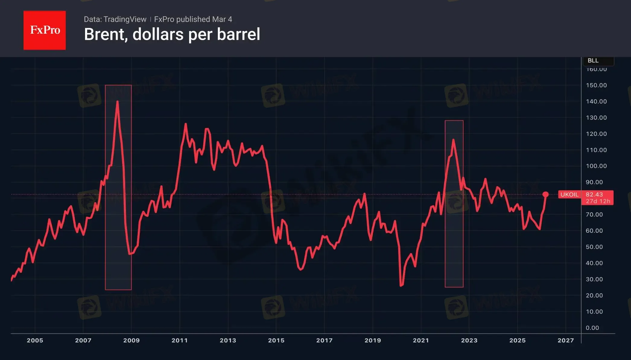 国际货币基金组织(IMF)认为,美国和以色列对伊朗的打击正加剧全球经济的不确定性。不过,目前距离危机爆发仍十分遥远。即便是最乐观的多头(看涨者)也不认为油价会涨至每桶120美元以上。当前油价明显低于俄乌武装冲突初期139美元的水平,更不用说在2008年全球金融危机前夕油价曾飙升至147.5美元这一高点。中东局势引发全球经济衰退的可能性仍不确定,毕竟1973 - 1974年石油危机以及1990 - 1991年萨达姆·侯赛因入侵科威特之后,都曾出现过这种情况。