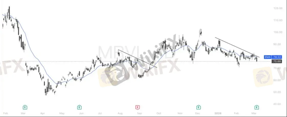 随着财报利好催化,迈威尔或结束震荡下行,开启反弹周期,下方支撑75美元,上方阻力位100美元附近。