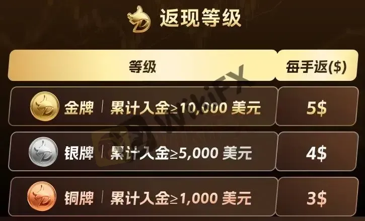 • 返现开启后,系统将按累计入金所达等级自动核算返现。