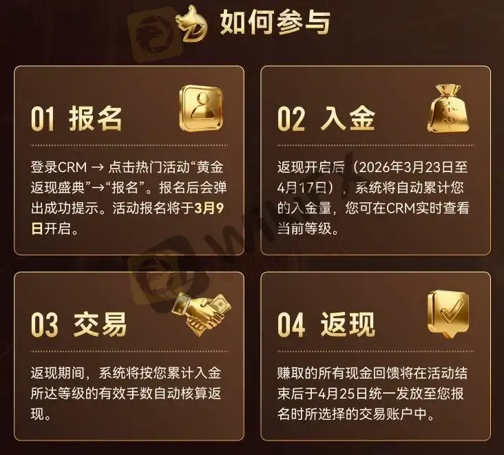摘要:冬尽春来,万象更新。由于本活动得到热情反馈,DBG Markets 于2026年3月23日至4月17日再度开启新春限时福利——“黄金返现盛典”,让财富与喜庆一路延续。活动期间,交易黄金每手最高可达$5美元现金奖励;交易越多,返现越多,奖励上不封顶!奖多少,由你定!本次返现共设置了三档等级,累计入金满 1,000 美元即可解锁返现资格! 活动详情:参与对象:本活动面向已完成 KYC 认证的 DBG