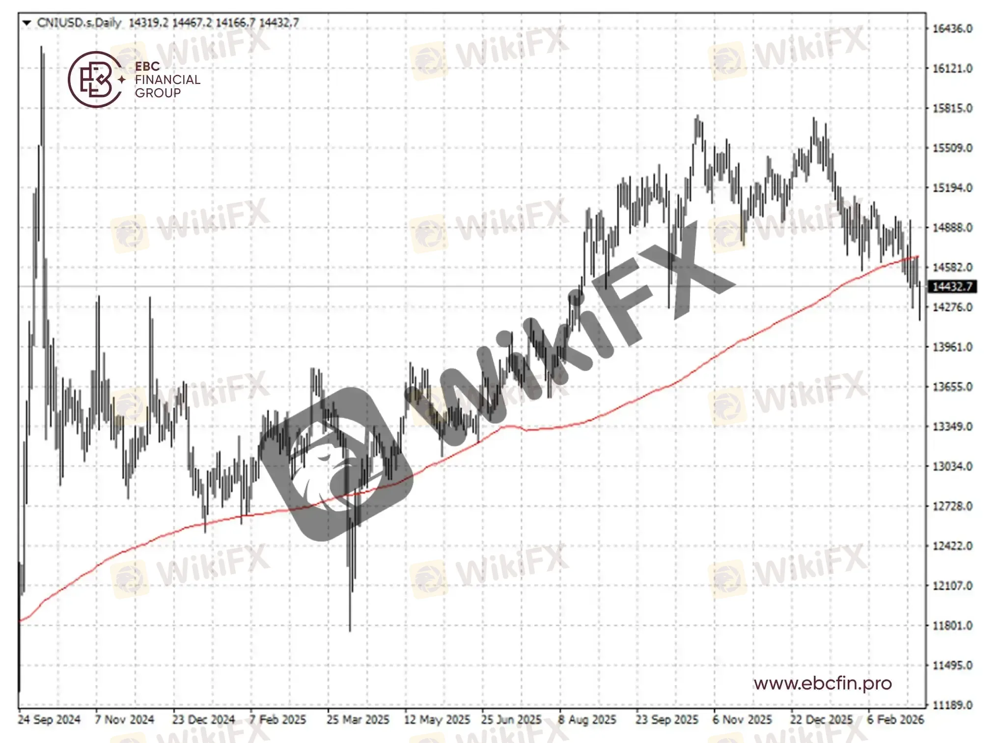 A50指数跟随全球市场下行,200日均线转为阻力位。由于跌破去年10月低位14263支撑,指数可能进一步回落至14100。