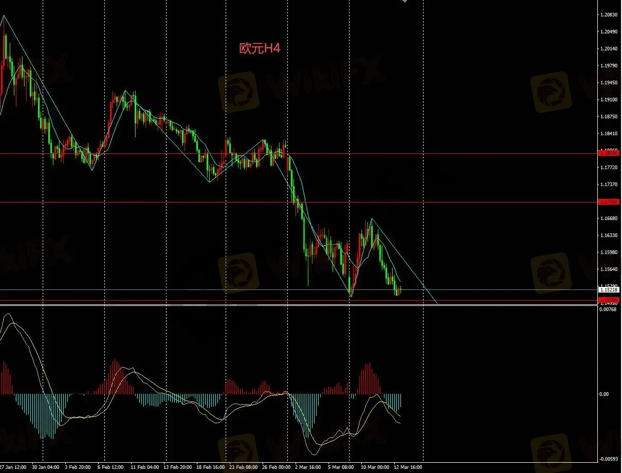 H4图表汇价,持续看空,逢高卖出操作或突破卖出,下方关键支撑位1.15;目前1.14。