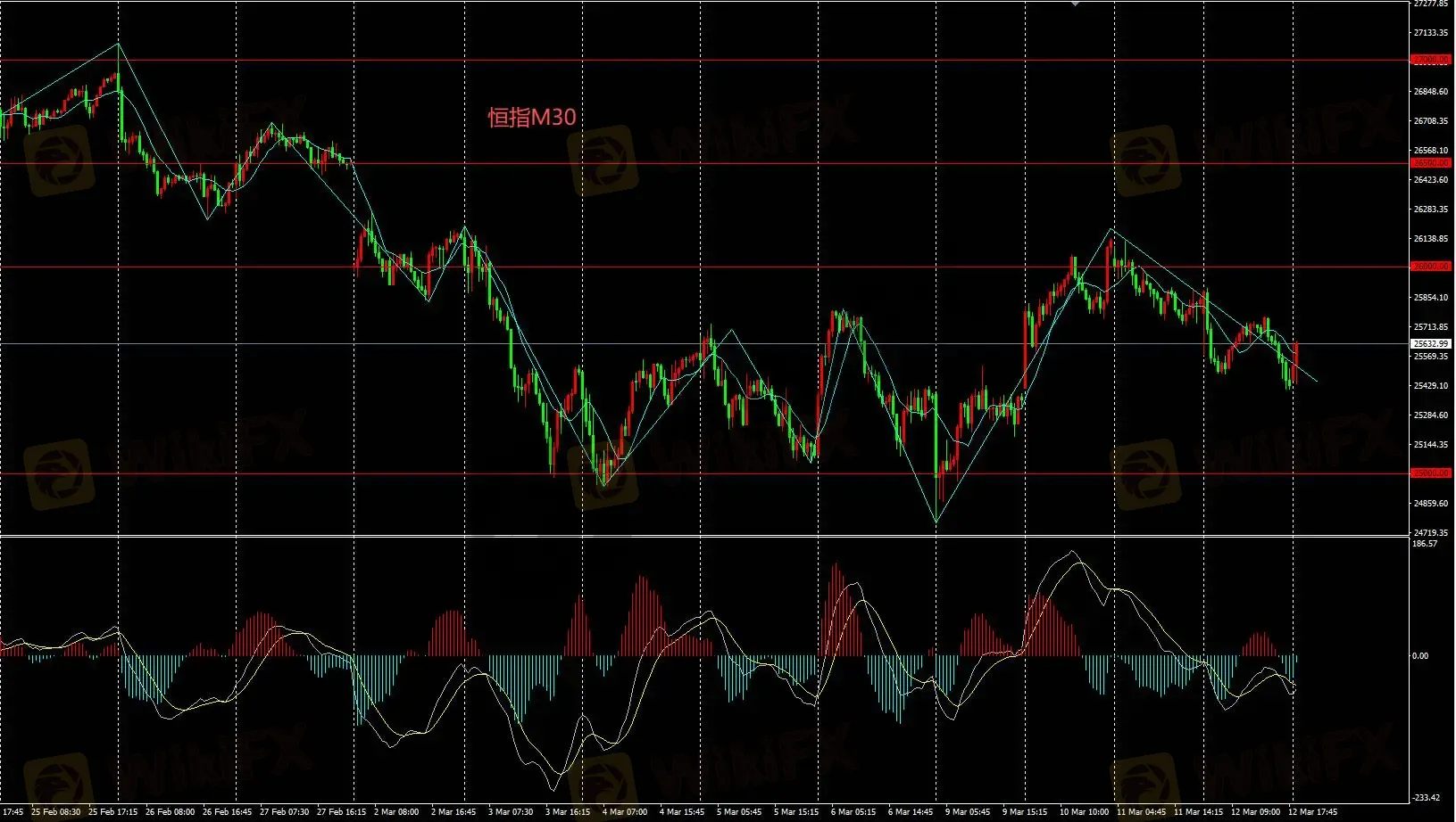 恒指M30日内若价格受阻于26000则将再次陷入震荡走势,多头可先行离场,但当前并不适合做空。