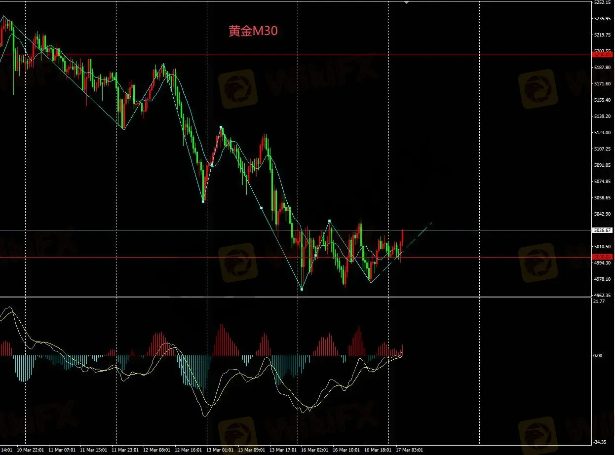 M30图表金价短期逢高卖出,当前重要支撑位5000,如若下破5000则空仓继续持有看空至4950甚至4900。