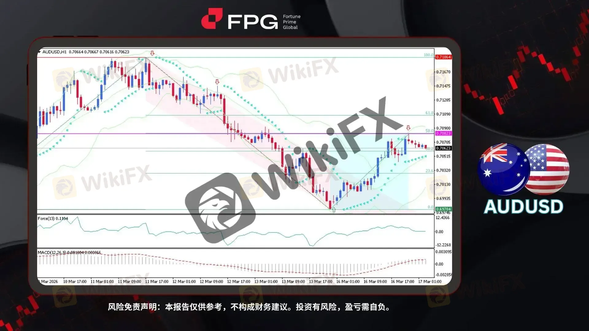 摘要:在H1周期图上,AUDUSD此前自0.7186大幅下跌至0.6978,在下行过程中形成了清晰的下降通道结构。价格曾短暂突破通道之外,但随后迅速回调并重新回到通道内部,确认当时空头趋势的延续性。在0.6978附近触及通道下沿后,行情出现反弹,推动汇价上行至0.7082附近,该位置与前期跌幅的50%斐波那契回撤水平基本重合。目前,AUDUSD交投于0.7062附近,在近期反弹后呈现中等波动并进入震荡整