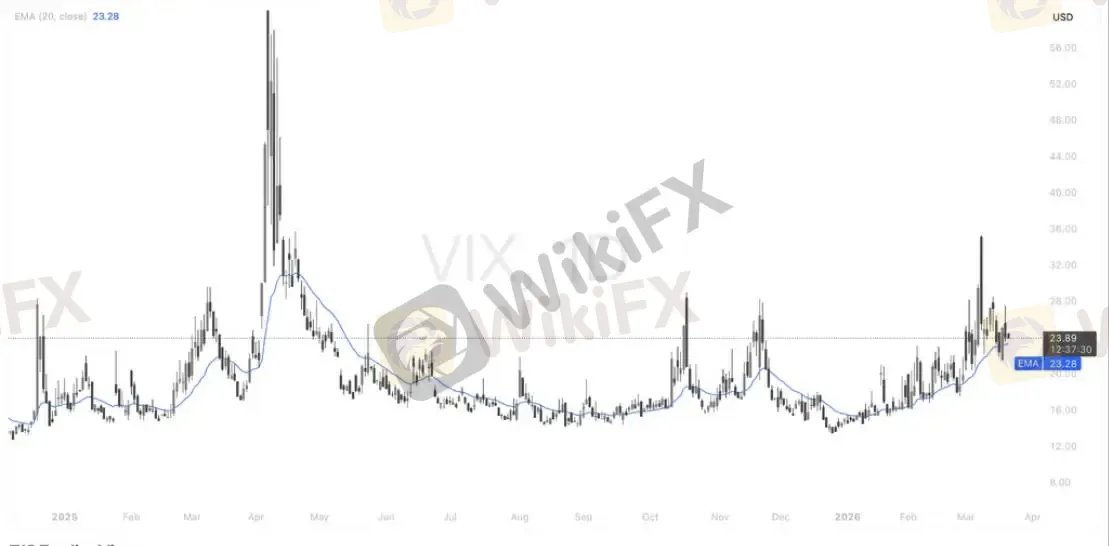 当前VIX维持在20上方运行,并围绕EMA20(约23.3)反复拉锯,显示市场恐慌情绪仍未完全释放但也未进入极端状态。前期冲高至30+后快速回落,说明短期避险情绪有所降温,但波动率中枢已明显抬升。