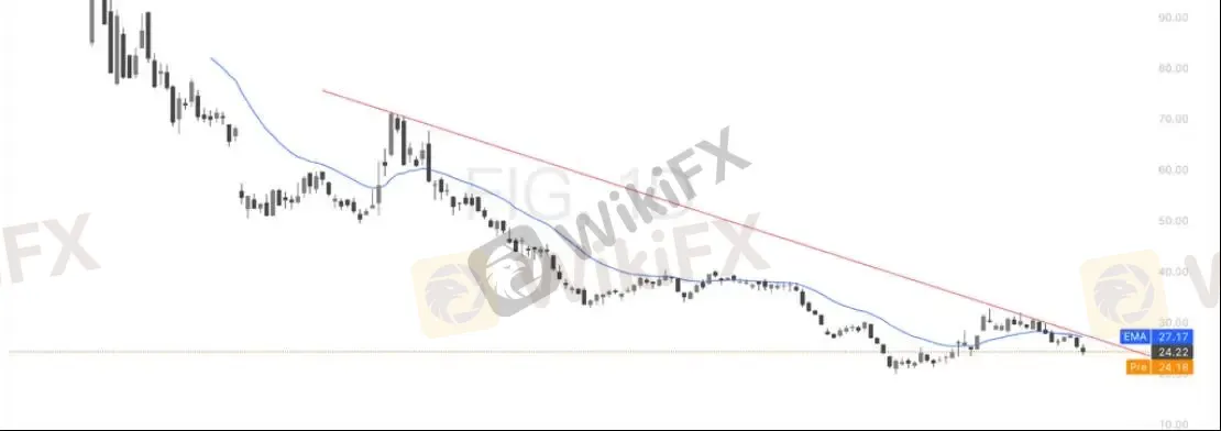 从技术面来看,FIG当前仍处于明确下行趋势中:自高位回落以来,股价持续运行在长期下降趋势线(红线)下方,同时始终受制于20日均线(约27.17美元)压制,反弹动能明显不足。当前价格约24.2美元,已逼近前期低位支撑区域。