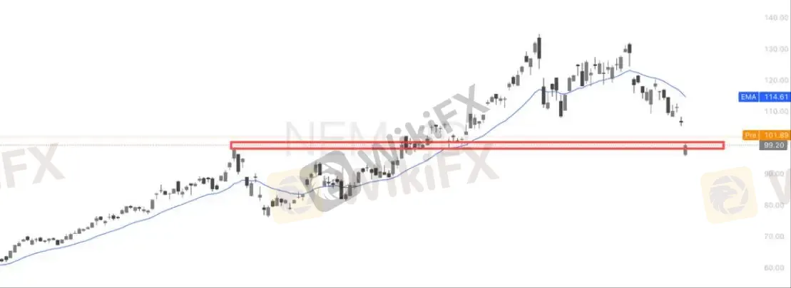 从技术面看,Newmont Corporation已回踩99–102美元关键支撑区(前期平台),当前价格约101美元,处于超跌+支撑共振位置。但上方20日均线(约114美元)已拐头向下,趋势转弱明显,因此这里更偏向下跌趋势中的反弹博弈:守住支撑有望反抽至108–115区间,若跌破99则可能打开新一轮下行空间。