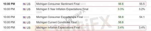 本周五22:00,将会有两项关于美国通胀率的重磅数据发布,分别是:美国3月密歇根大学消费者信心指数、美国3月一年期通胀率预期终值。两项数据的发布机构都是密歇根大学,公布的都是终值,也就是初值的调整结果。