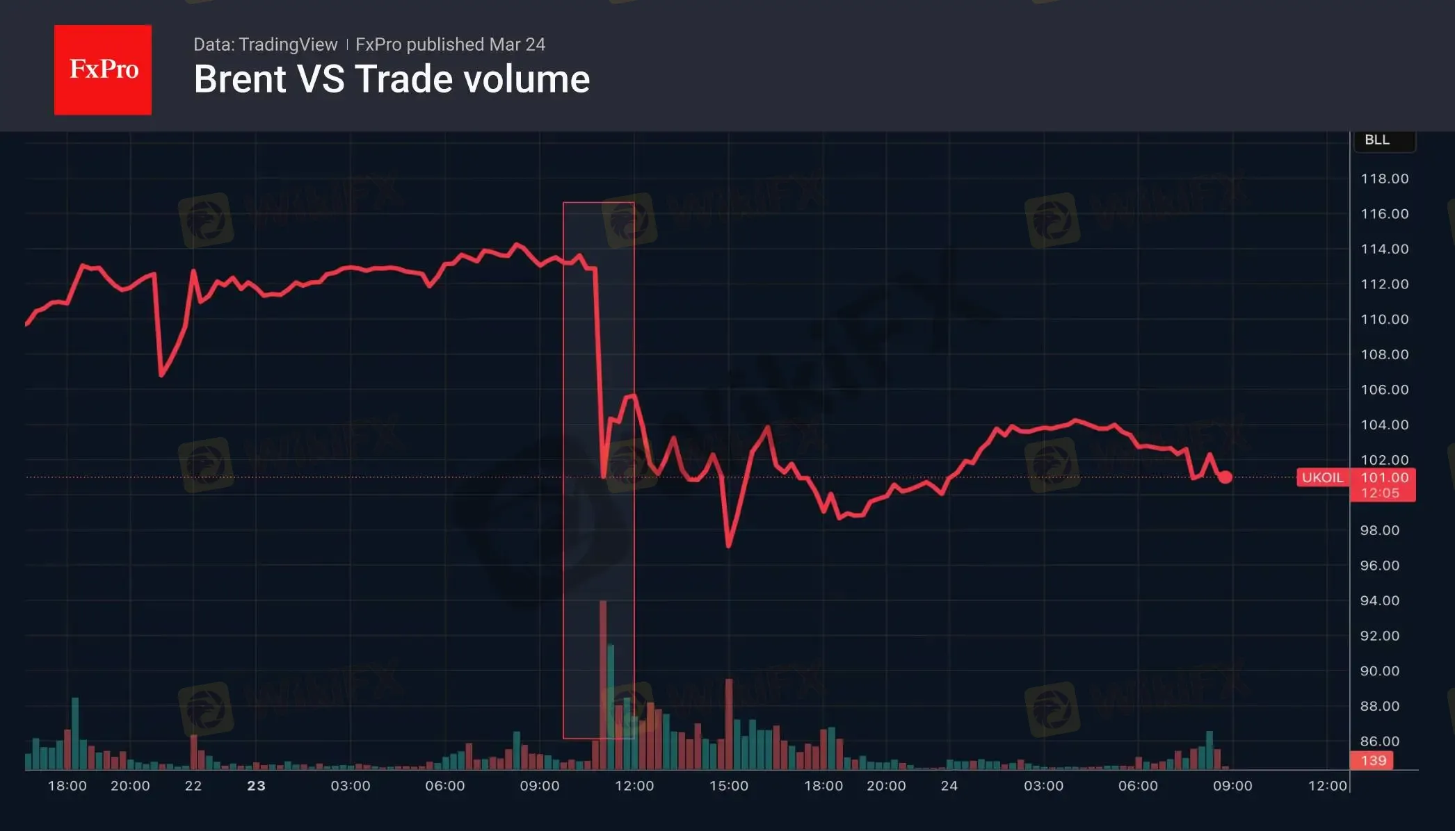 伊朗否认与美国进行谈判。德黑兰认为白宫正在以此方式操纵石油市场。耐人寻味的是,在唐纳德·特朗普发布社交媒体帖子前15分钟,相当于约600万桶布伦特原油的期货合约在两分钟内完成换手,交易量几乎是同期平均水平的十倍。简言之,有人已重仓押注原油价格下跌。