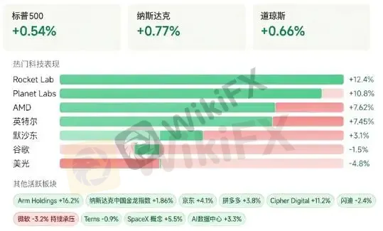 板块层面亮点纷呈:受“SpaceX即将递交招股书”传言刺激,商业航天概念股普涨,Rocket Lab、Planet Labs等涨幅均超10%;英特尔、AMD因CPU供货紧张报道双双涨超7%,Arm Holdings在发布自研AGI CPU并给出强劲营收展望后更大涨逾16%。