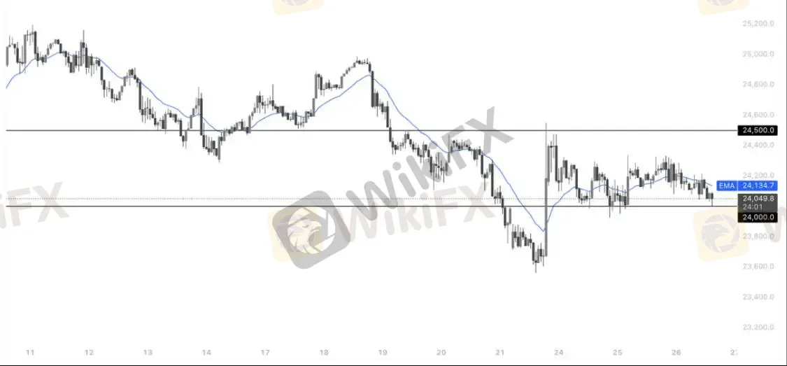 从当前走势来看,纳指整体仍处于下行后的弱势整理阶段,价格在24,000–24,500区间内反复震荡,20EMA持续走平,显示短期趋势尚未形成明确方向。上方24,500为关键压力位,多次反弹均受阻;下方24,000则构成短期支撑,一旦有效跌破,可能再次测试前低区域。