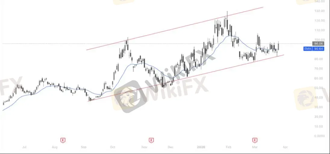 ASTS 正处于一个长期上升通道的下轨支撑区进行技术性筑底。尽管股价从 2 月份约 $130$ 的高位大幅回落,但在触及长期上升通道的底部红线后展现出极强的韧性。目前,股价已成功重回 $20$ 日指数移动平均线(EMA,约 90.64) 之上,且最新报价 96.06 正在测试前期的小平台压力位,显示出多头正在夺回短期控盘权,市场对商业航天板块的乐观预期(如 SpaceX 招股书传闻及行业并购热度)正在为其提供反弹动能。