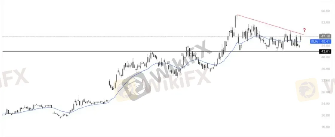 技术面上,股价放量突破长期下行压制,筑底反转迹象初显。 从日线图观察,英特尔(INTC)在 $42.01$ 美元的关键水平(前期支撑/阻力转换位)附近完成了坚实的底部构筑。最新一根大阳线以强劲动能突破了由红线标示的下降趋势线,这是空头趋势终结的重要信号。目前股价报 47.18,已稳稳站在 20 日指数移动平均线(EMA,约 45.41) 之上,且均线呈现向上的发散态势。短期内,若股价能守住 $45美元的回踩支撑,上方目标将指向55美元的整数关口及前期跳空缺口,整体走势由弱转强进入修复周期。