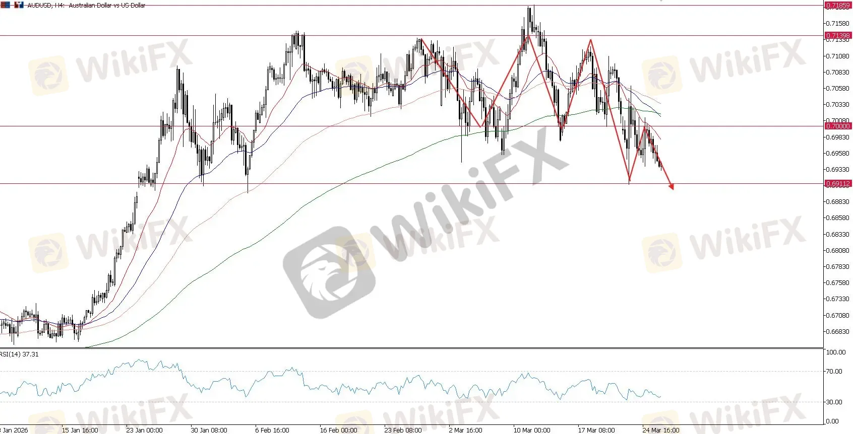 技术面上,0.7000 的失守是一个重大的看跌进展。如果澳元不能迅速收复这一门槛,将为更深度的结构性回调甚至更广泛的趋势反转打开大门。目前,0.6900 被视为下一个主要的支撑底;只要汇价持续承压于 0.7000 下方,其最小阻力路径将依然偏向下行。
