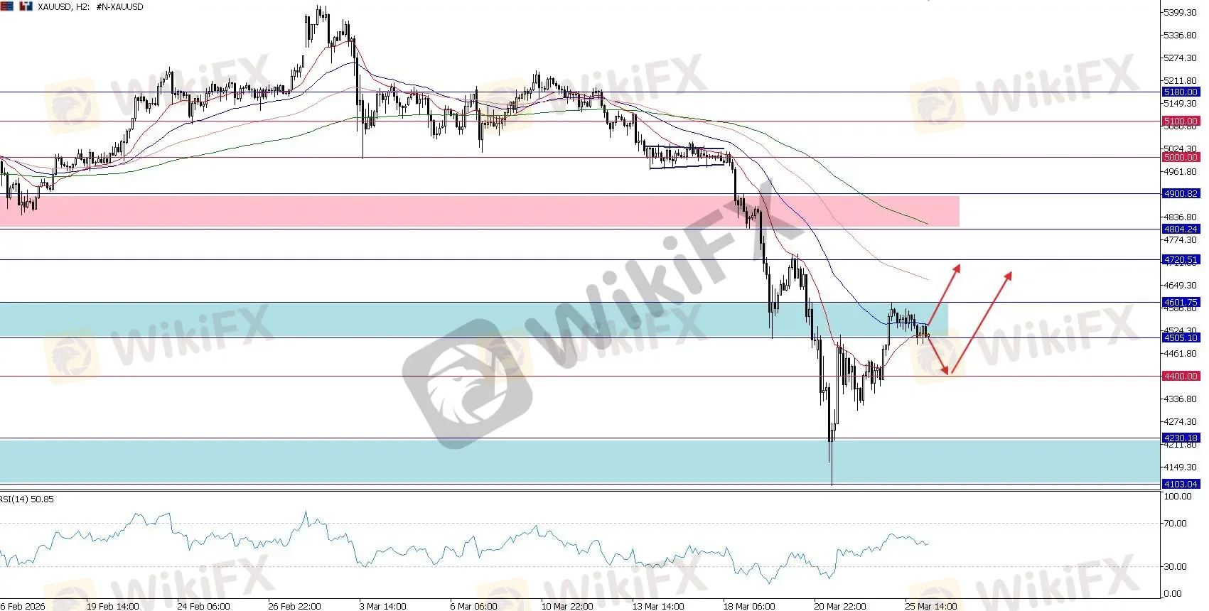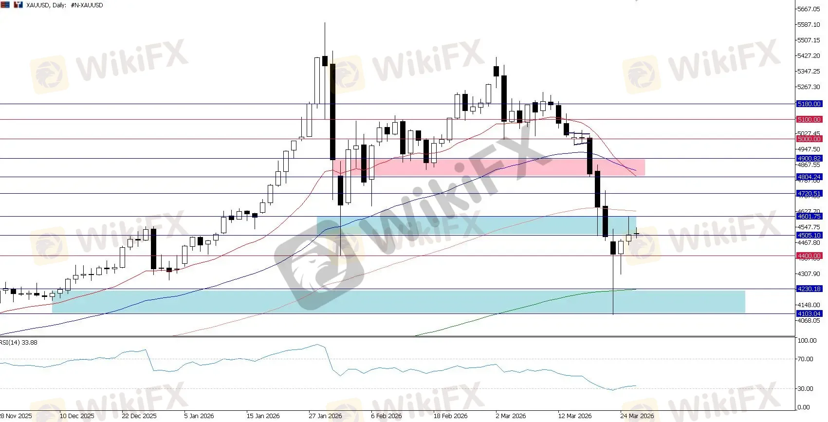 目前,技术信号仍高度矛盾。4,500 至 4,600 区域已成为重大的上方阻力,意味着黄金可能仍会面临短期余震带来的抛售压力。与此同时,4,100 至 4,200 需求区正在构筑一个潜在的重大结构性支撑底。