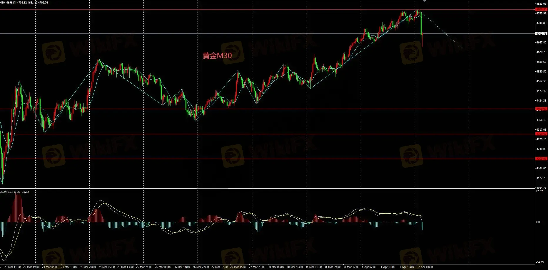 M30图表金价日内逢低买入操作,重点关注金价在4800变动,如若不能上破及时获利了结。