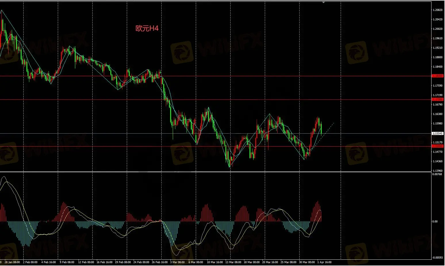H4图表汇价,处于下跌后的反弹走势,昨日快速拉升,短期内宜观望,如果汇价回调后仍然维持在1.15上方可轻仓介入多头;目标1.17甚至1.18。