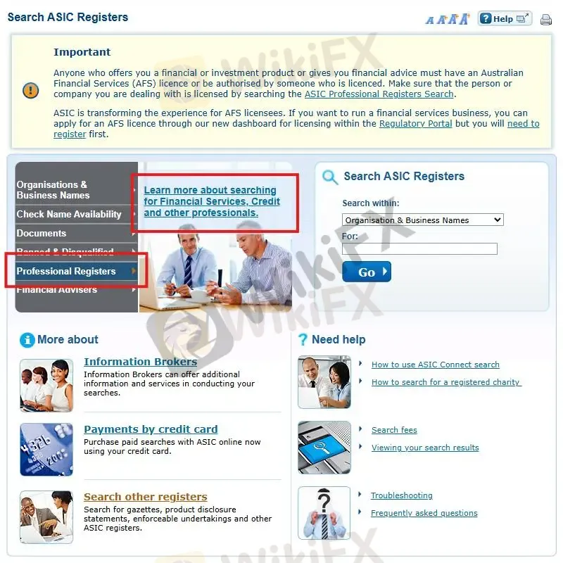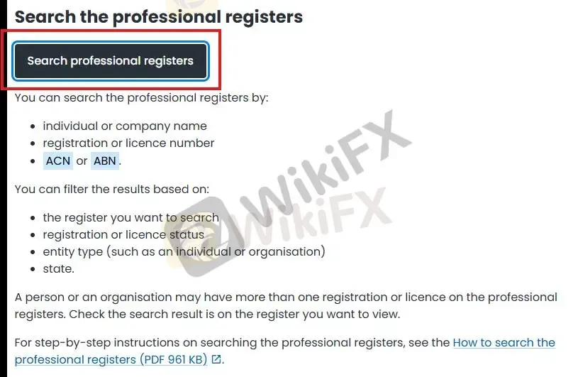 第 1 步: 进入网站后,在 “Search within ASIC registers” “Professional Registers”,进入金融专业人士与机构查询页面。
