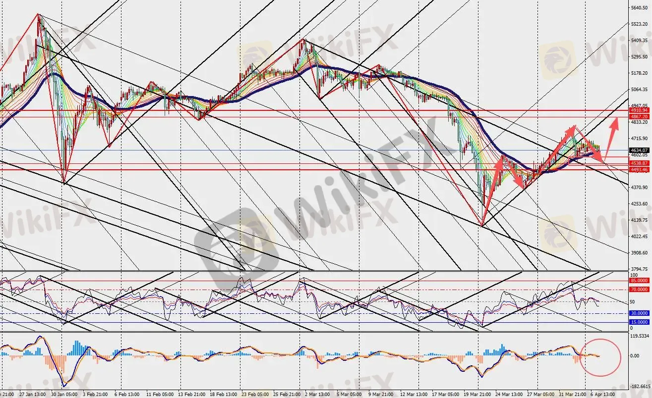 黄金H4级别震荡回落,MACD双线和量能柱在零轴附近收敛。从历史经验看,类似地缘事件初期往往推高金价,但若演变为持久的通胀与增长担忧混合局面,黄金的表现则会分化。在当前高波动环境下,黄金作为资产配置的一部分,仍具备长期战略价值,尤其对冲货币贬值和系统性风险。