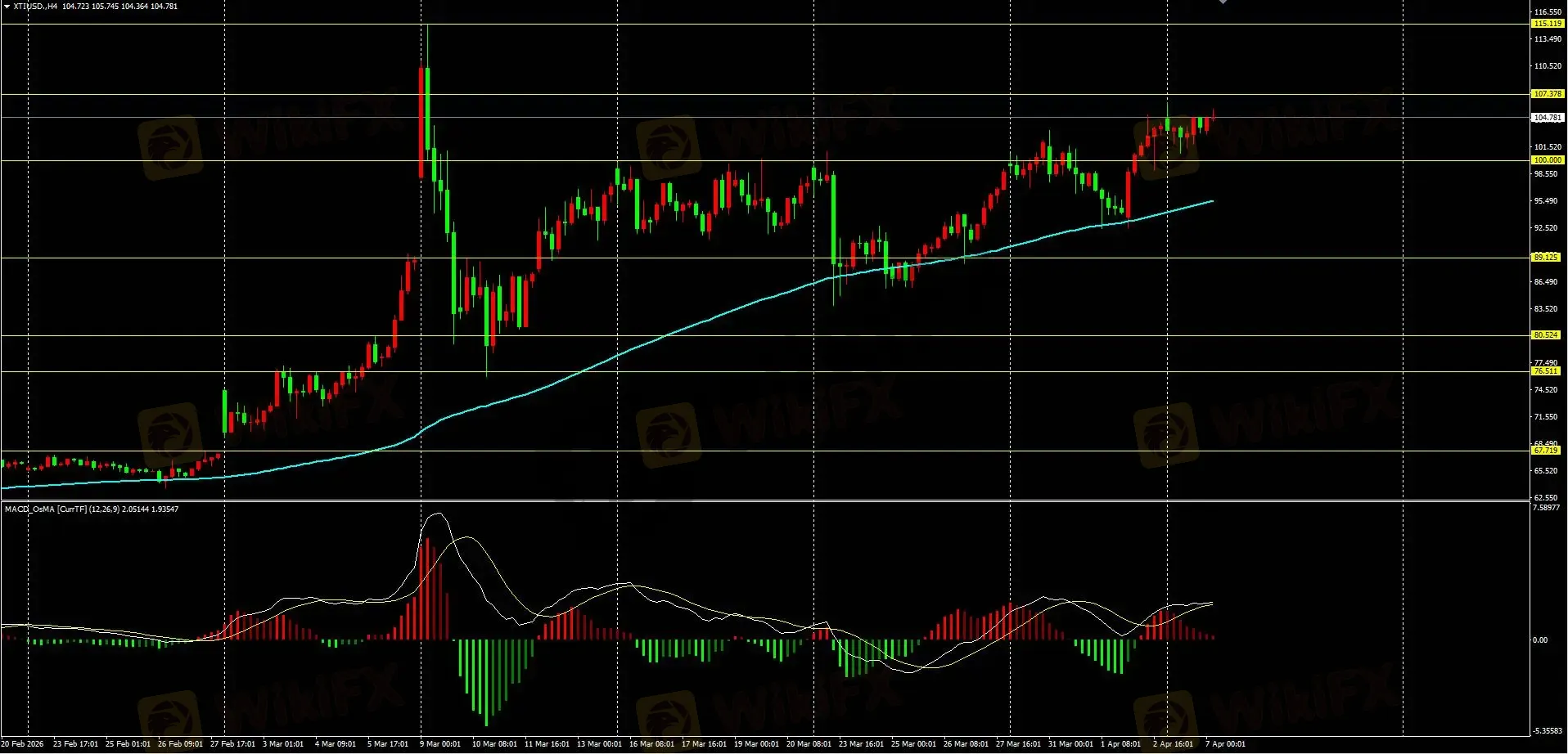上一个交易日开盘价:104.572,最高价:106.417,最低价:100.766,收盘价:103.699。