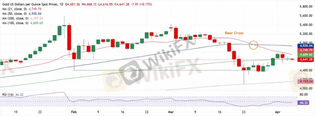 金属目前持有普遍看跌的短期基调,因为它仍低于$4,774.95的21日简单移动平均线(SMA)和$4,935的50日SMA,使得近期反弹被限制在修正范围内。动量也与此基调一致,相对强弱指数(14)徘徊在45附近,表明在早期超卖反弹后,买盘兴趣有所减弱。看跌基调也因正在进行的“死叉”而得到证实。21日SMA于3月25日收盘价低于50日SMA,确认了看跌交叉。
