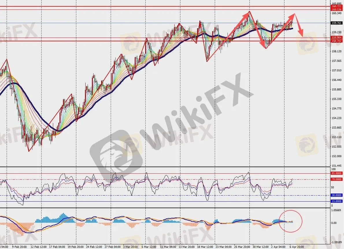 基本面:美元兑日元此前一周,汇价再次逼近160整数关口,但随着伊朗局势出现停火框架消息,避险美元面临抛压,而日元在潜在干预担忧下未能进一步走弱。原油价格维持高位震荡,霍尔木兹海峡紧张态势虽有缓和迹象,但仍对全球能源供应链构成压力,日本作为主要原油进口国,其经济前景承压进一步凸显。
