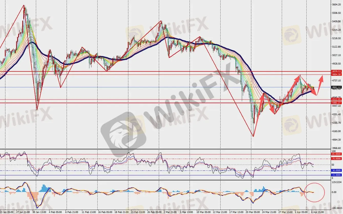 技术面:黄金H4级别小幅震荡,并在48日多空分界线附近运行。另一方面,MACD双线和量能柱在零轴附近收敛。投资者需密切关注本周美联储会议记录及CPI数据,谨慎注意4600-4700区间的突破机会。