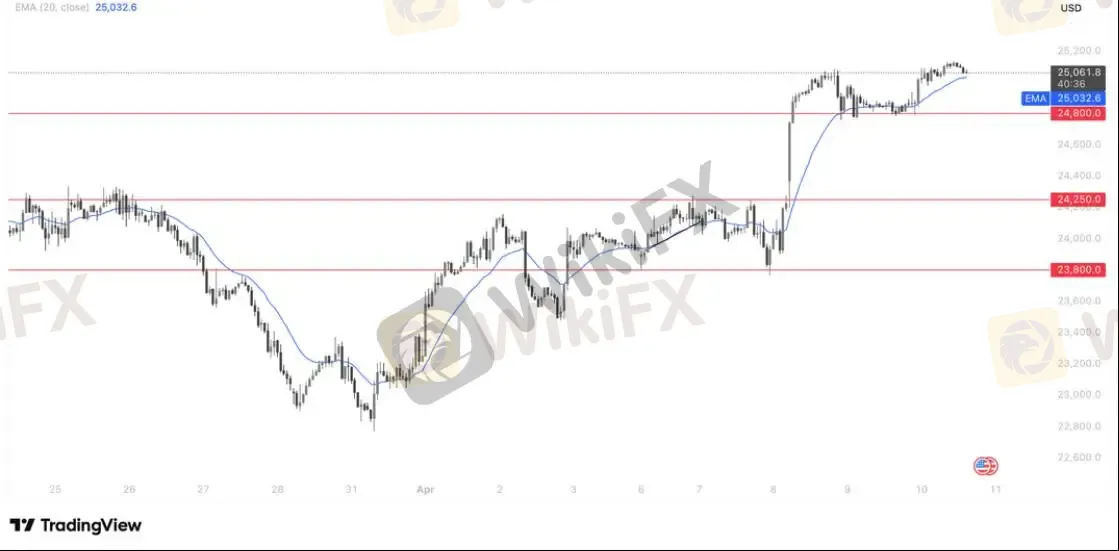纳斯达克 100 指数当前维持强势多头格局,价格依托 20 周期 EMA(25032.6)稳步上行,短期在 25061.8 附近震荡整固,24800 一线为关键支撑,若今晚 CPI 数据未出现极端超预期利空,指数有望依托均线支撑继续挑战前高,反之若通胀大幅超预期引发加息预期升温,则需警惕回踩 24800 支撑的风险,整体趋势仍以多头主导,短线关注数据落地后的方向选择。