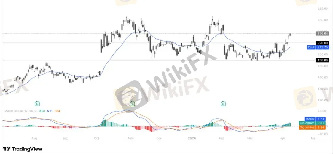 技术面上,股价已突破 190–220 美元箱体震荡区间,连续两日反弹,可关注 220 美元附近回踩企稳后的介入机会。