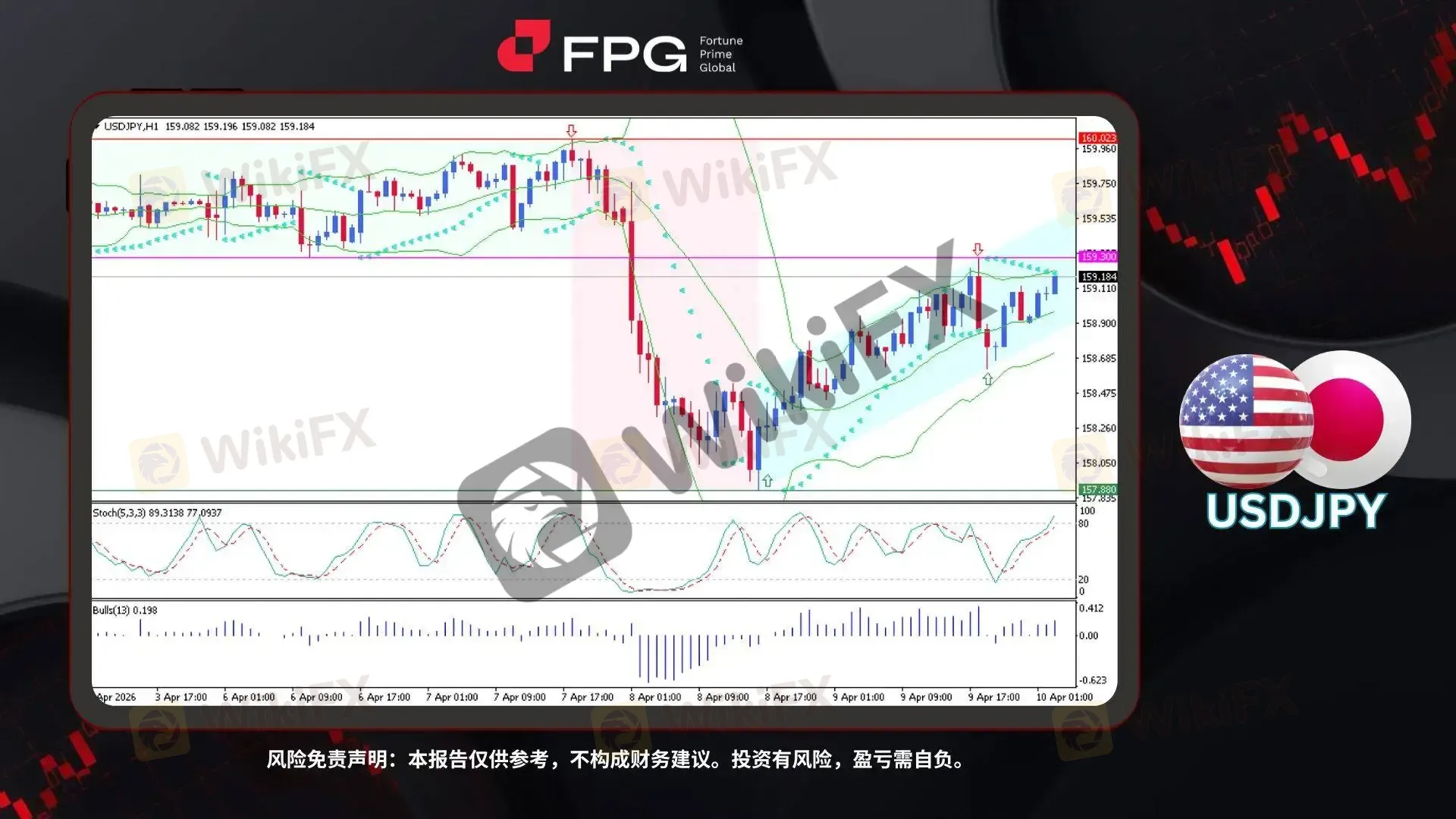 摘要:在H1(1小时)时间框架图上,USDJPY本月初整体在一个相对稳定的横盘通道内运行。随后价格出现快速下跌,从160.02跌至157.88,并形成明显的空头K线。从该低点开始,趋势发生反转,转为上涨走势,并形成上升通道。目前价格在159.18附近运行,正尝试逼近159.30阻力位。该位置此前在早期横盘阶段为支撑位,如今已转变为阻力位。从技术指标来看,布林带显示价格已从下轨反弹,目前正向上轨移动,表明