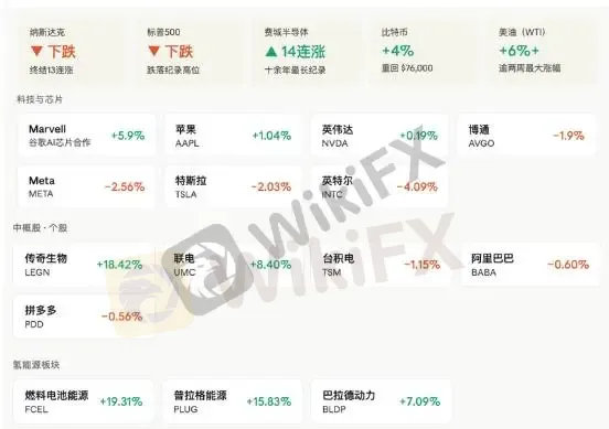 摘要:大盘回顾美股高位震荡,纳指13连涨终结|AI算力争夺白热化美股昨日在地缘风险升温下整体走弱,纳指终结13连涨、标普跌离高位,但费城半导体指数逆势创14连涨纪录;原油强劲反弹逾6%,氢能源、Marvell等个股大涨,航空邮轮承压;苹果宣布库克9月卸任、Ternus接班,亚马逊追加50亿美元投资Anthropic,谷歌新一代TPU即将发布,AI算力竞争持续升温。今日盘前分析地缘博弈叠加AI驱动,风险与