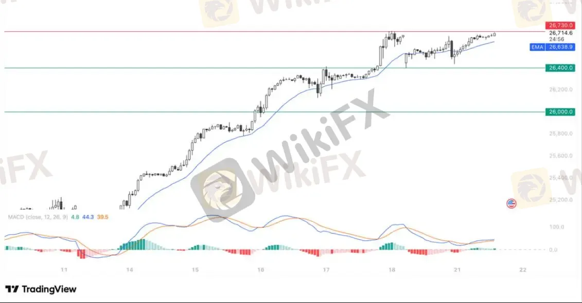 昨日纳指100回调至26400一线获得有效支撑,随后价格迅速修复并重新站回EMA20(26638)上方,当前报26713附近,距上方阻力位26730仅一步之遥。从结构看,14日以来的上升趋势完整,EMA20持续上扬托底,多头主线未受动摇。需关注能否在26730压力位上方形成有效突破。若多头能够站稳26730并放量上行,则上方空间将进一步打开;若再度回落,26400仍是核心支撑,跌破则需重新审视短线趋势。
