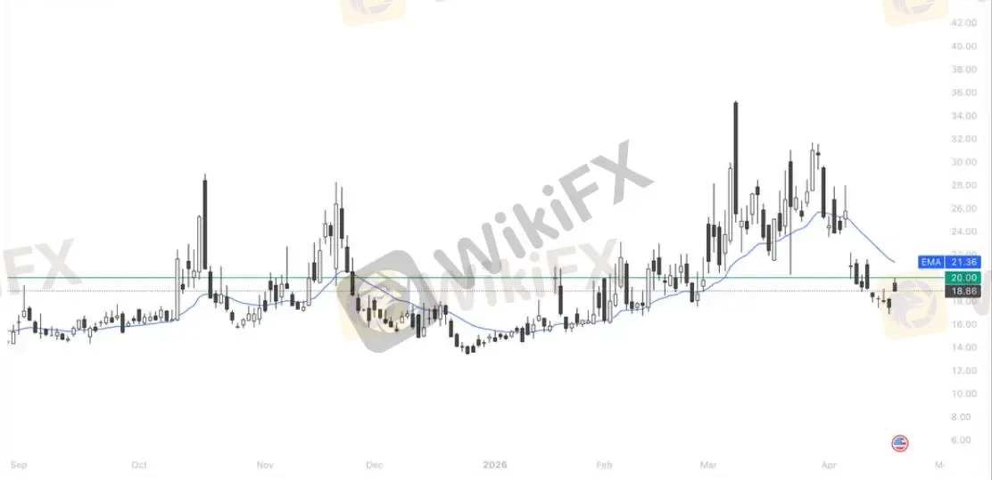 近期在20关口附近形成明显支撑与压力的双重考验。当前价格18.86,已跌破20这一市场普遍关注的“恐慌分水岭”,EMA20(21.36)同步向下弯头,均线对价格形成压制,空头结构初步确立。从历史形态看,VIX每次在20以下企稳并持续走低,往往对应权益市场的风险偏好持续修复阶段。目前价格围绕18.86窄幅震荡,若后续无重大地缘或宏观冲击,VIX继续向15一线回落的概率偏高,这将为权益资产、尤其是高贝塔的科技与成长股进一步走强提供支撑。需警惕的是,美伊谈判若出现破裂等尾部风险,VIX可能快速重返20以上,届时市场情绪将再度收紧。