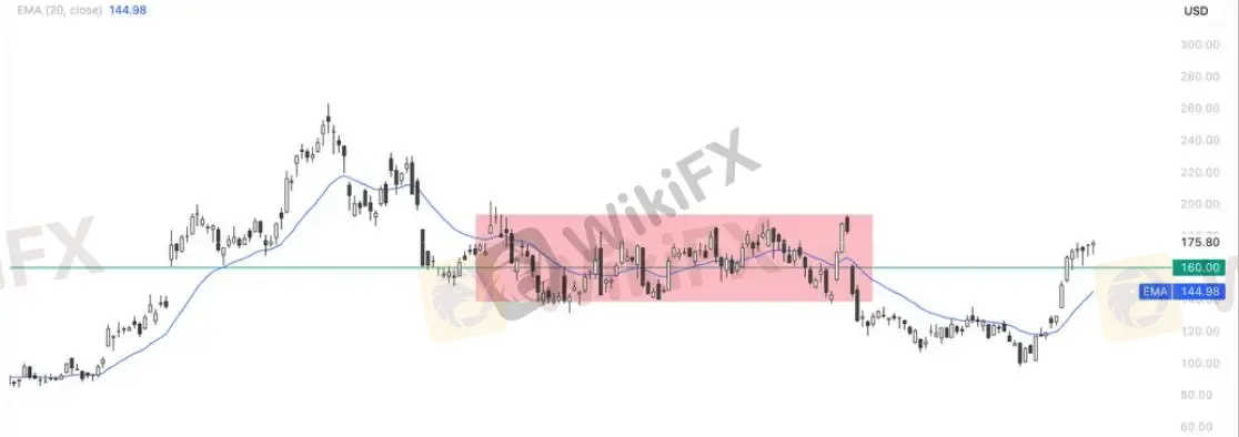 ALAB在去年10月见顶260后持续下行,10月至2月间在160-200区间长达四个月的横盘整理(红框标注区域)构筑了扎实的筹码密集区。2月下旬价格跌破160后加速下探至100附近,完成最后一跌的恐慌出货,随后强势V型反弹,4月重新收复160关键位,当前报175美元附近。160一线经历长期压力测试后,此番有效突破意义重大——压力与支撑完成角色互换,该位置下方聚集大量早期套牢盘的解套成本,形成天然防守。只要150-160支撑不破,逢回踩均可视为中线介入机会,上方目标参考200及前期密集筹码区220。