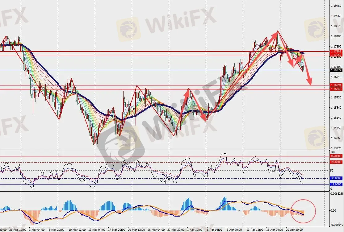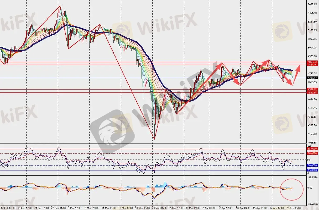 技术面:黄金H4级别震荡回落,并在48日多空分界线下方运行。此外,MACD双线和量能柱在零轴下方扩张。特朗普发表声明后,人们寄希望于霍尔木兹海峡问题能够得到解决,黄金价格因此略有回升。