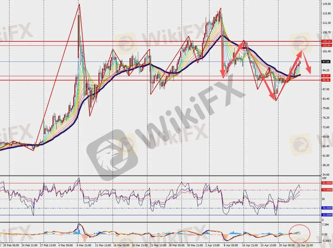 技术面:原油H4级别震荡反弹,并在48日多空分界线上方运行。另一方面,MACD双线和量能柱在零轴附近扩张。而由于伊朗战争导致的供应中断,美国的总出口量达到了创纪录的水平。尽管库存意外增加,但油价仍有所上涨。