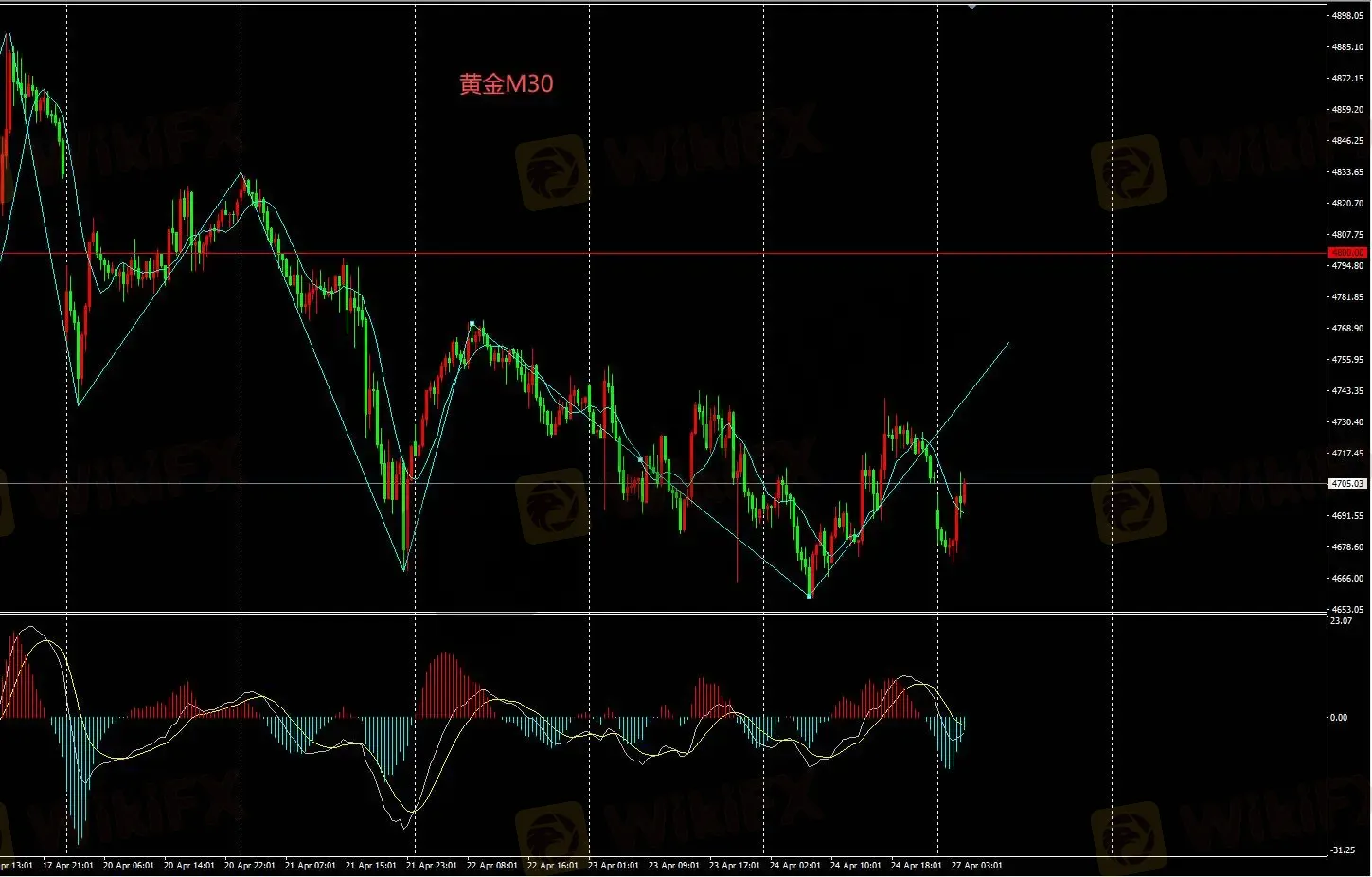 M30图表金价当前持续空头走势,日内看空,但是需牢记近期H4仍然看多,逢低买入操作,金价必须等待上破4700后方可介入。