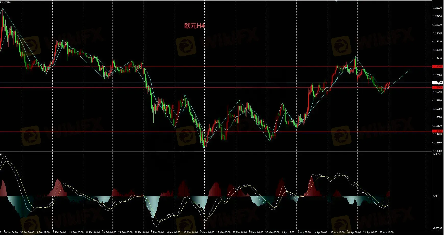 H4图表汇价,采取逢低买入操作,下方支撑1.17,需再次等待汇价上破该支撑位后方可介入做多,汇价在此价格下方则持续等待。