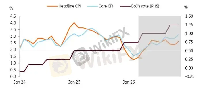ING经济学家预计,日本整体与核心通胀率可能自5月起涨至2%以上。尽管日本当地媒体援引知情人士表示日本央行4月将维持利率不变,随后的通胀率进一步上涨仍将有助于该央行推进政策正常化进程,预计到今年末累计加息50个基点。
