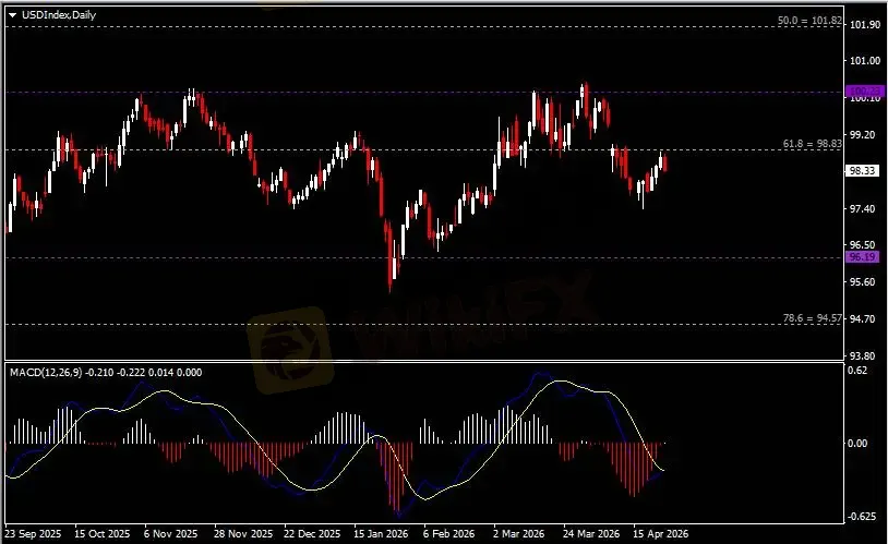 日线图显示美元指数遇阻回落,当前承压于98.80阻力。从MACD来看,快慢线形成金叉,红色动能柱收缩殆尽。指数走势和动能柱的变化呈分歧。