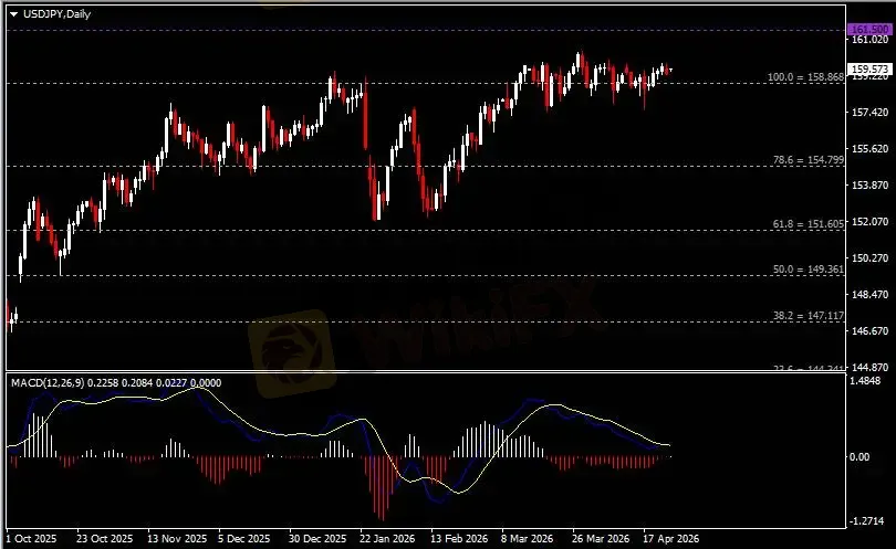 日线图显示美元兑日元回调下跌,当前仍收于158.90支撑。从MACD来看,快慢线金叉依旧,红色动能柱收缩殆尽。汇价走势和动能柱的变化呈分歧。