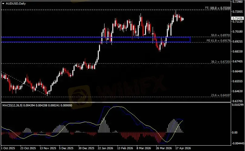 日线图显示澳元兑美元恢复反弹,当前仍承压于0.7230阻力。从MACD来看,快慢线逐渐收窄,白色动能柱温和收缩。汇价走势和动能柱的变化呈分歧。