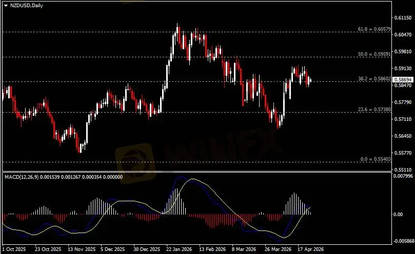 日线图显示纽元兑美元反弹回涨,当前收于0.5860支撑。从MACD来看,快慢线逐渐收窄,白色动能柱温和收缩。汇价走势和动能柱的变化呈分歧。