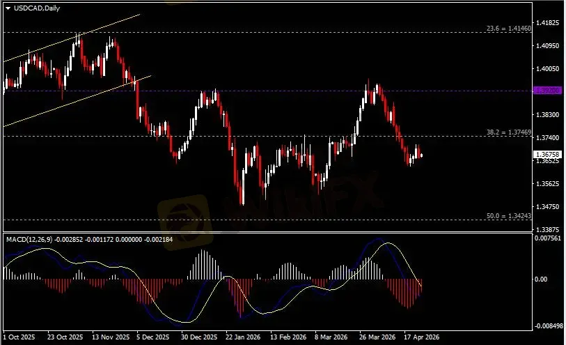 日线图显示美元兑加元回调下跌,当前承压于1.3750阻力。从MACD来看,快慢线呈拐向,红色动能柱温和收缩。汇价走势和动能柱的变化呈分歧。